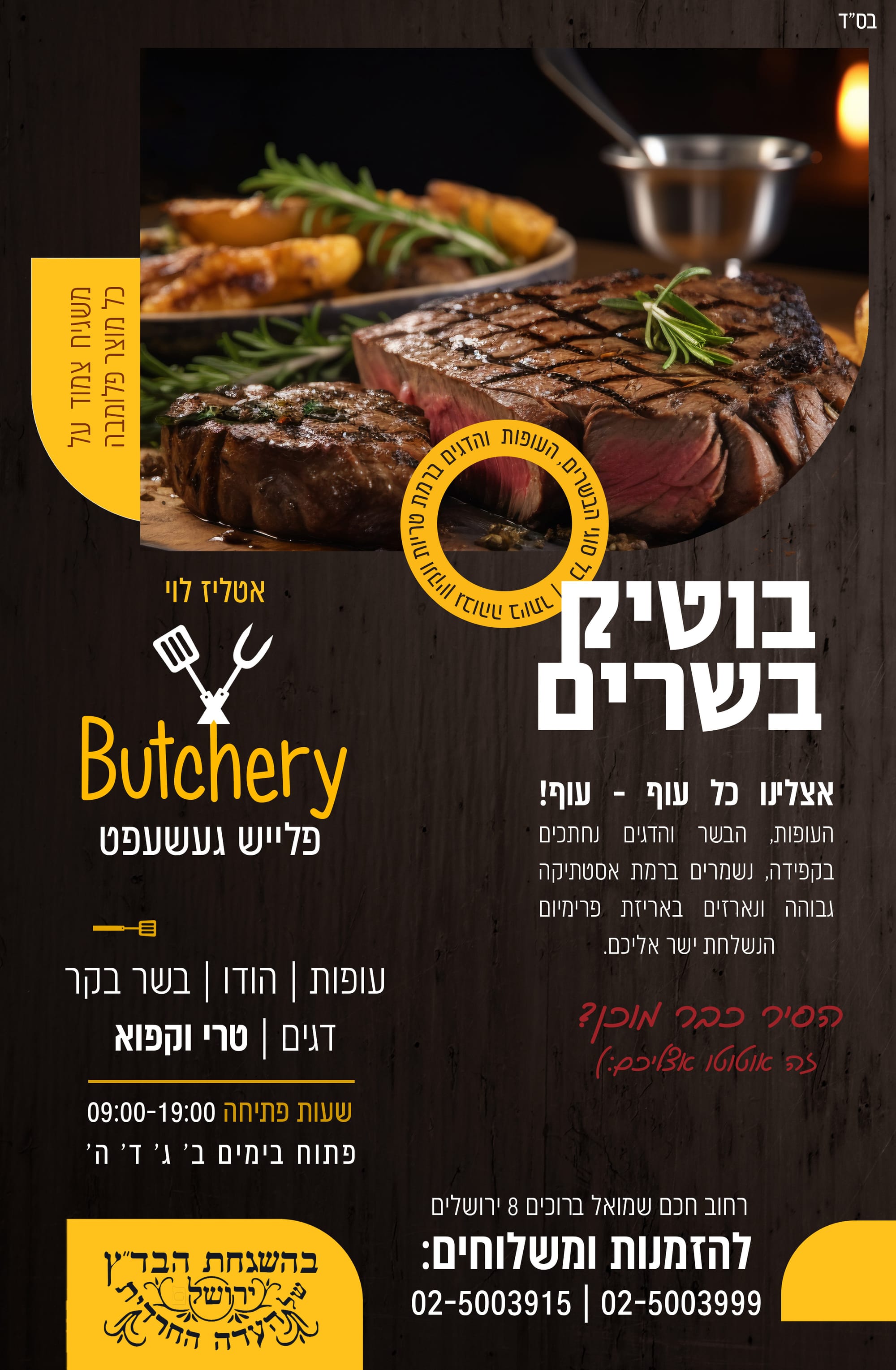 איטליז הראשי 'לוי' בירושלים בהכשר העדה החרדית ידועה לכל אחד על היתרונות שלה שירות, ניקיון, איכות, טריות, האריזות היפות והמסודרות, החנות נמצאת ברחוב ברוכים 8 בירושלים כשעל כל מוצר יש פלומבה של משגיח צמוד מטעם בד''ץ העדה החרדית את השירות כולם מכירים, ואת הרמת ניקיון שהביא לנו לקוחות מכל מקום בארץ כולם רואים בשרים עופות הודו ודגים טריים וקפואים באיכות וברמה טובה מטעמים - נקניקיות, כבדים, וכ'ו לכבוד שבת קודש או לארוחה או לאיזה מנגל קטן אנחנו יכולים להציע לכם כל דבר שאתם צריכים כדי לשבח לכם את הארוחה שירות משלוחים לכל חלקי הארץ צרו קשר איתנו 02-5003999 ניתן גם להזמיו דרך הוואטסאפ 025003999
